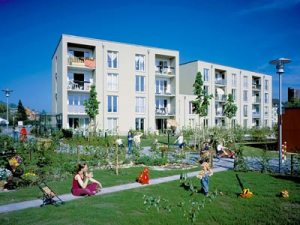 GWL Terrein, realizzato negli anni Novanta su un’area di 6 ettari che in precedenza era occupata da un grande impianto di trattamento dell’acqua. A GWL Terrain vivono circa mille persone e tra un edificio e l’altro ci sono soltanto sentieri, piste ciclabili e prati. L’accesso è consentito esclusivamente ai mezzi d’emergenza, mentre per disincentivare l’uso dell’auto i parcheggi edificati a ridosso del quartiere possono contenere non più di 135 mezzi. E’ attivo un servizio di car sharing (auto in multiproprietà) utilizzato dal 10% degli abitanti e gli altri preferiscono la vasta rete di piste ciclabili e le linee tramviarie intorno al quartiere