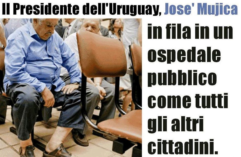 Presidente dell’Uruguay, si trattiene solo 485 dollari dello stipendio per vivere e destina gli altri 7500 alla beneficenza. Vive di poco, anzi di pochissimo, in una vecchia fattoria senza neppure l’acqua corrente, ma solo l’acqua del pozzo. È vegetariano, è sposato, ha diversi animali.Napolitano, vive al Quirinale e guadagna 239.192 euro all’anno, aumentati di 8.835 euro nell’anno in corso.