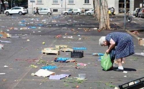 Una anziana cittadina che RIPRENDE cio’ che altri hanno buttato ed e’ rimasto per la via di un mercato.