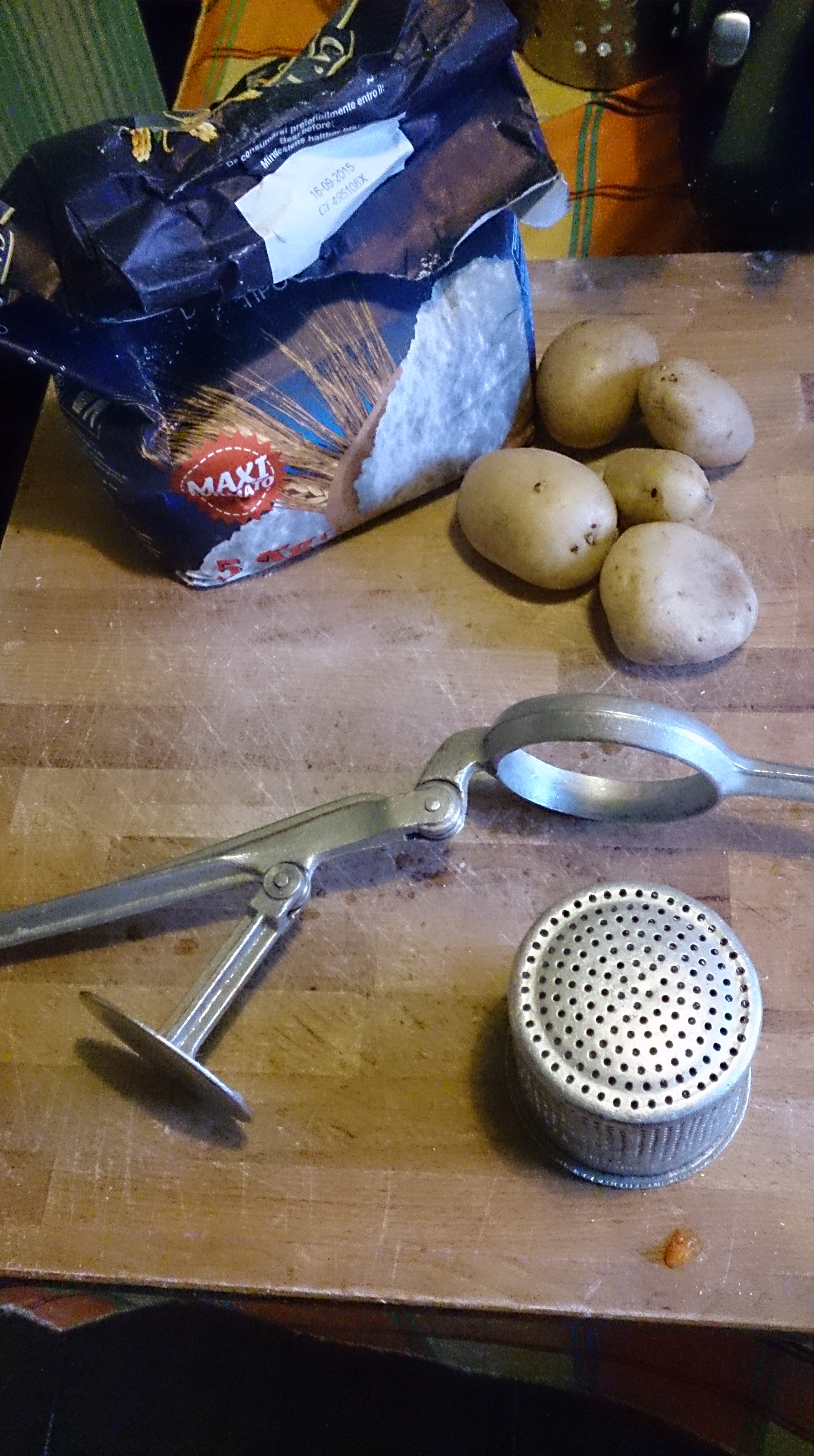 Preparate la farina in una ciotola e spremete le patate con uno schiaccia patate, dopo averle pelate. .
